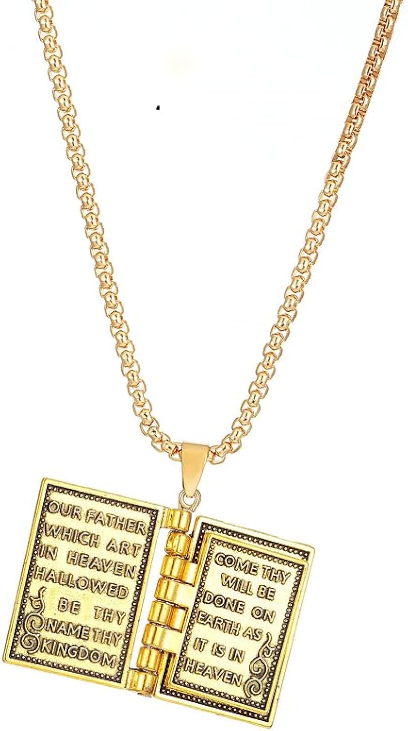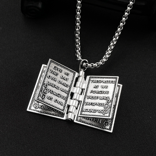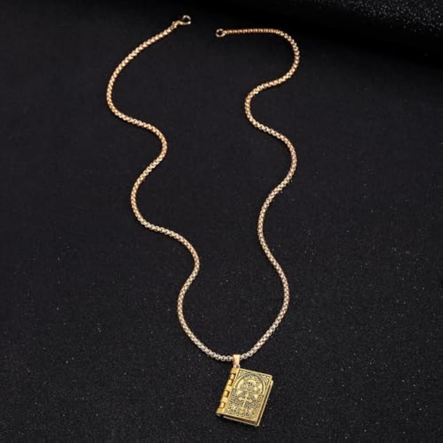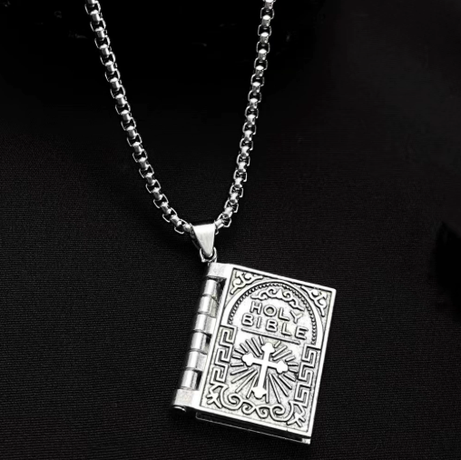 This necklace isn’t just symbolic — it actually opens like a real book, with detailed scripture engraved inside.