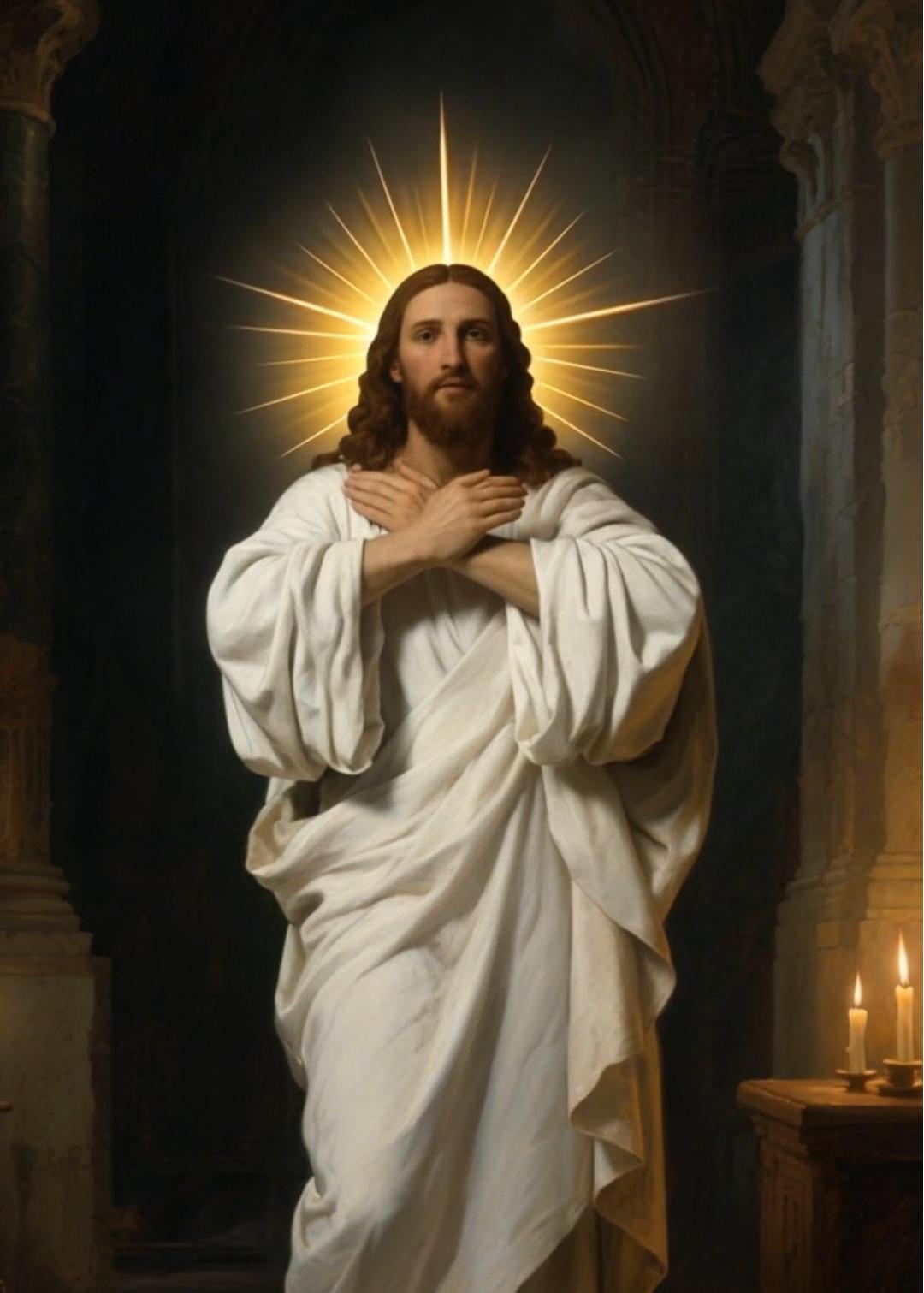 Behold the risen Savior. Dressed in white and crowned with glory, Jesus stands in divine radiance—a symbol of resurrection, light, and the fulfillment of grace.
