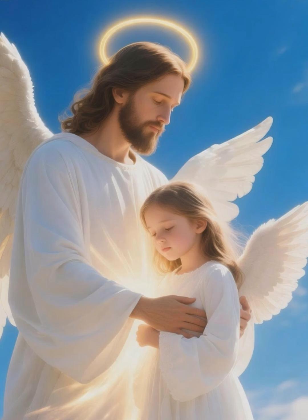 Discover comfort in divine arms. This heartwarming image of Jesus embracing an angelic child radiates tenderness, purity, and the unshakable promise of protection and eternal care.