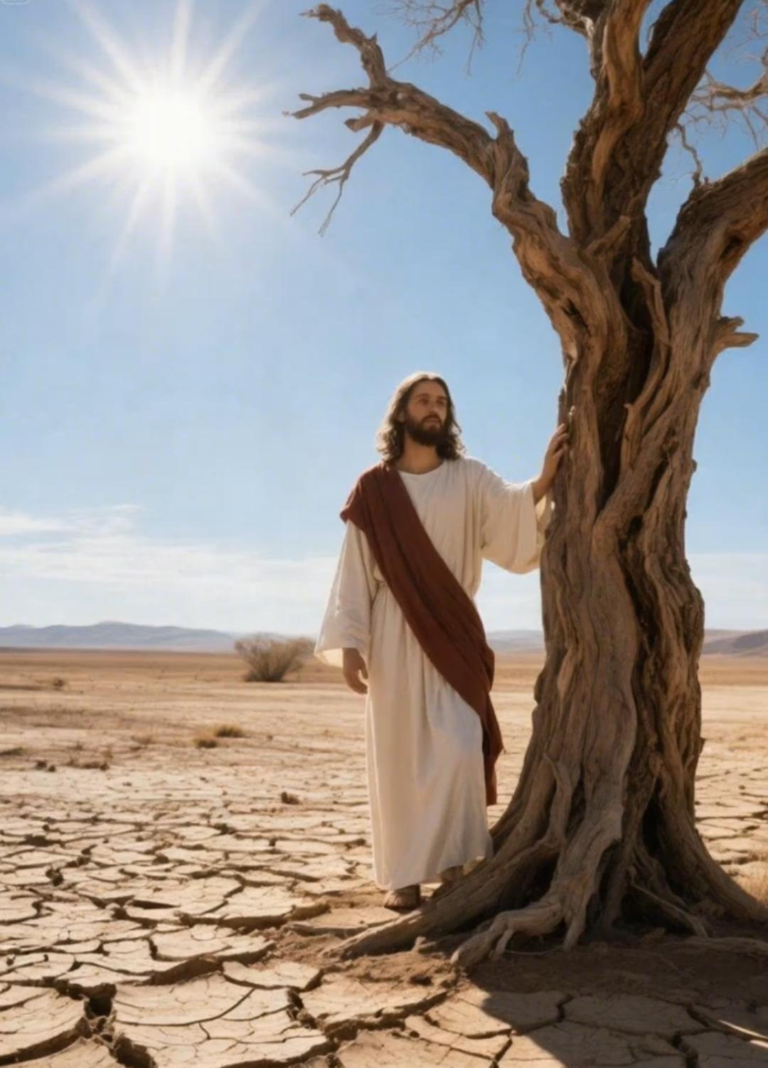 Walk with Him in solitude and strength. This image of Jesus standing by a lone tree in the barren wilderness reflects endurance, spiritual testing, and the quiet power of faith under pressure.