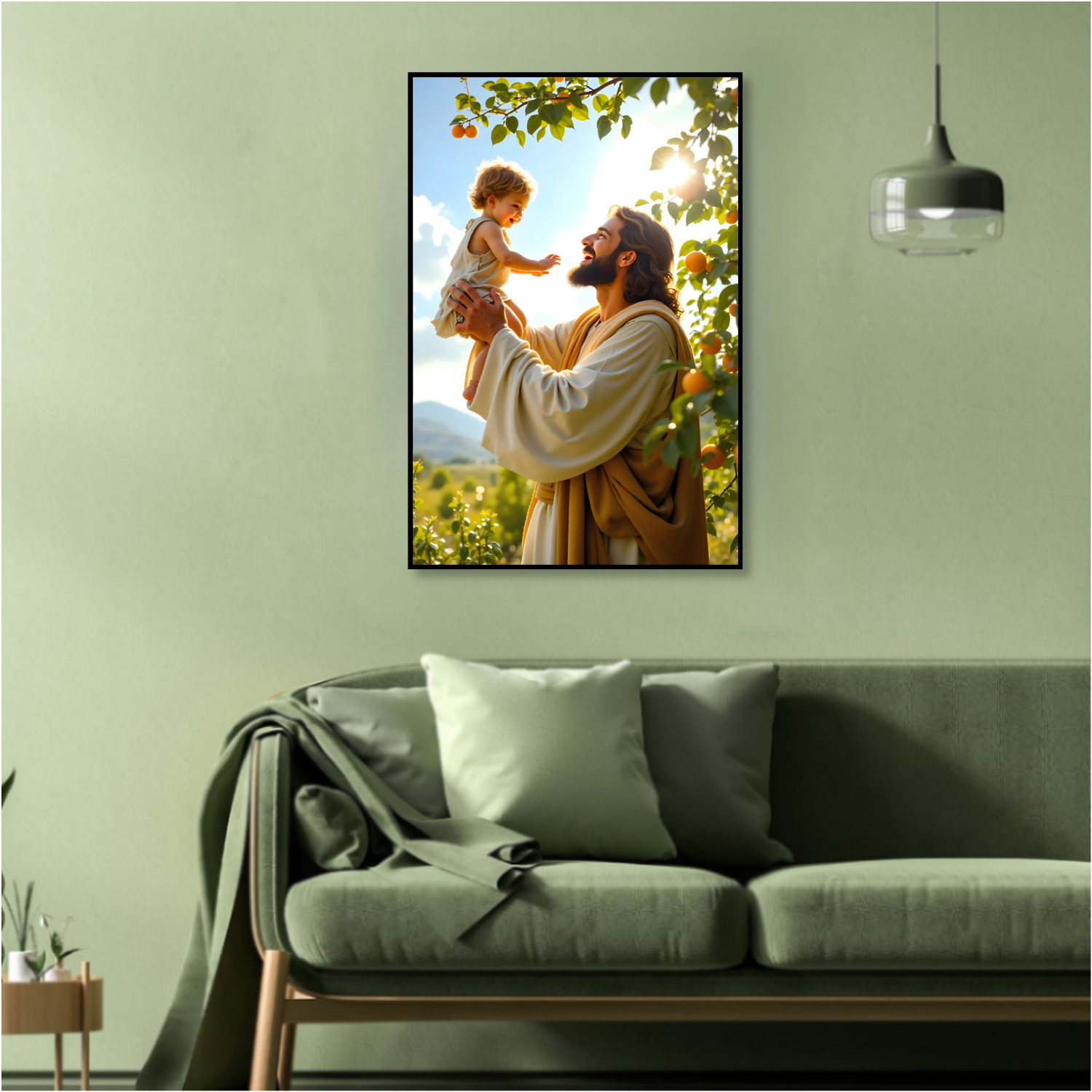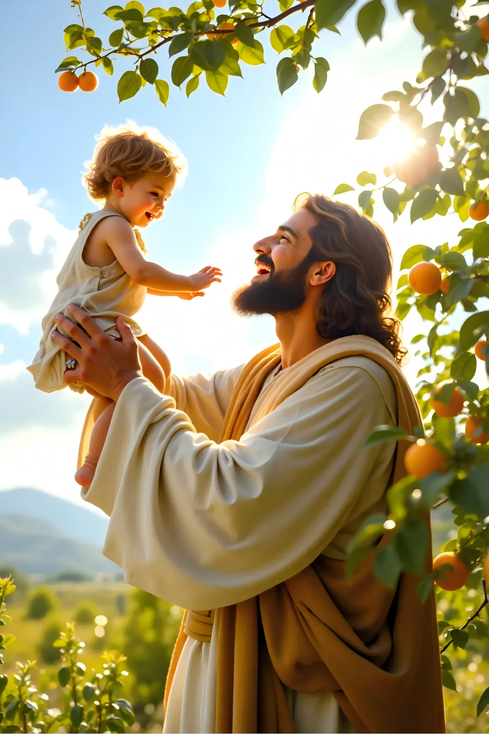 With joy in His eyes and light in His arms, Christ lifts a child among golden orchards. This heartwarming image captures the pure love of the Father—tender, joyful, and eternal.
