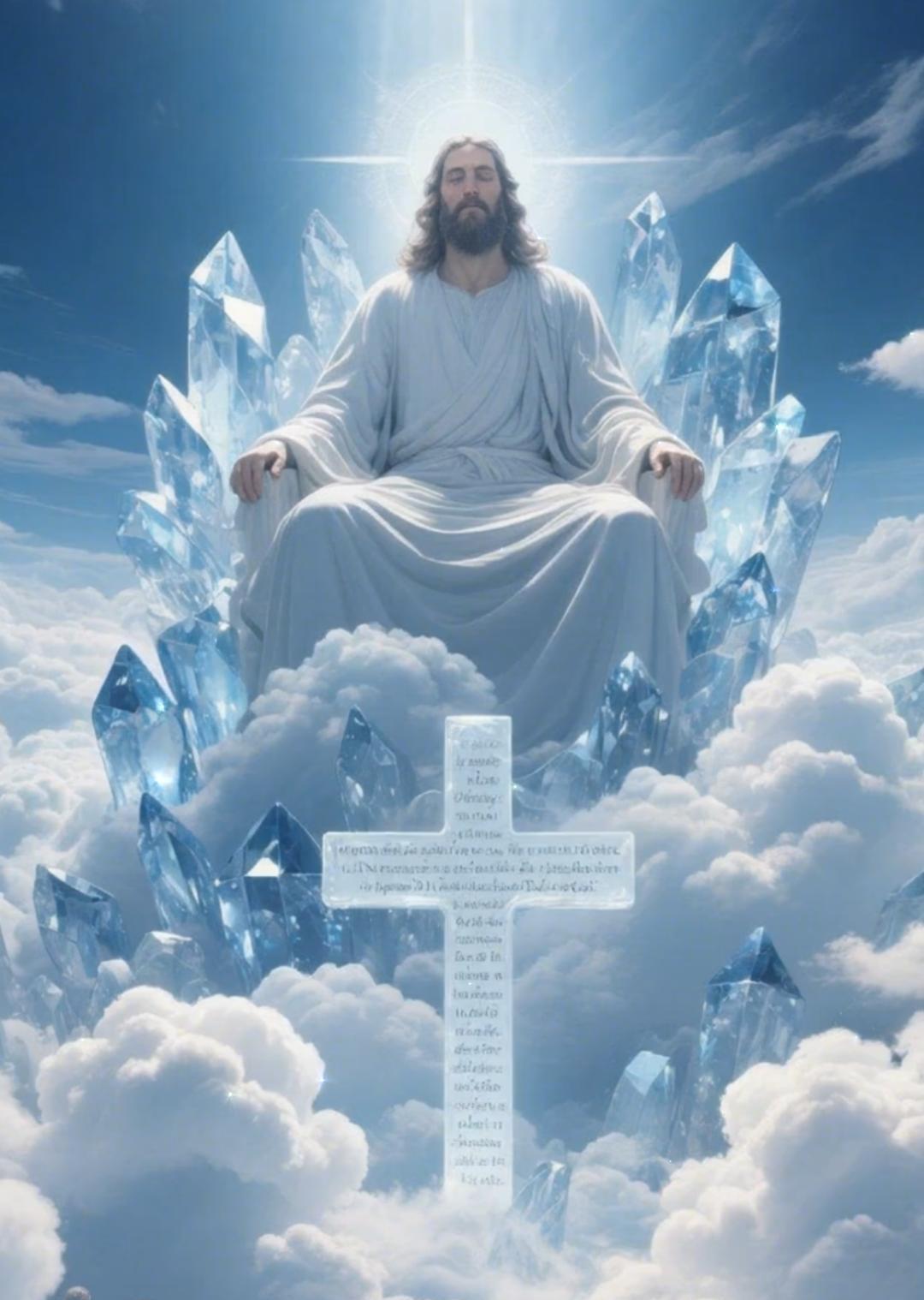Ascend into a vision of eternity. Jesus sits in majesty above the clouds, surrounded by crystal light and heavenly worshipers—a magnificent portrayal of divine kingship and eternal peace.